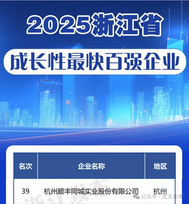 顺丰同城获选“浙江省服务业百强企业”“浙江省成长性最快百强企业”10月15日,浙江省企业联合会、浙江省企业家协会、浙江省工业经济联合会正式发布“2025浙江省百强企业”系列榜单。顺丰同城同时入选“浙江省服务业百强企业”与“浙江省成长性最快百强企业”两份榜单,与阿里巴巴、绿城、网易等国内知名企业共同上榜。顺丰同城跻身浙江双百强榜单,表明公司在保持营收规模优势的同时,亦满足了“高增长”与“高研发投入”的双重标准,实现了规模与质量的协同发展。